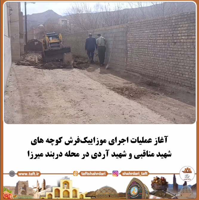 به گزارش روابط عمومی شهرداری تفت، عملیات اجرایی پروژه اجرای موزاییکفرش کوچههای شهید مناقبی و شهید آردی واقع در محله دربند میرزا، در راستای ارتقای کیفیت معابر و بهبود عبور و مرور شهروندان، آغاز شد.